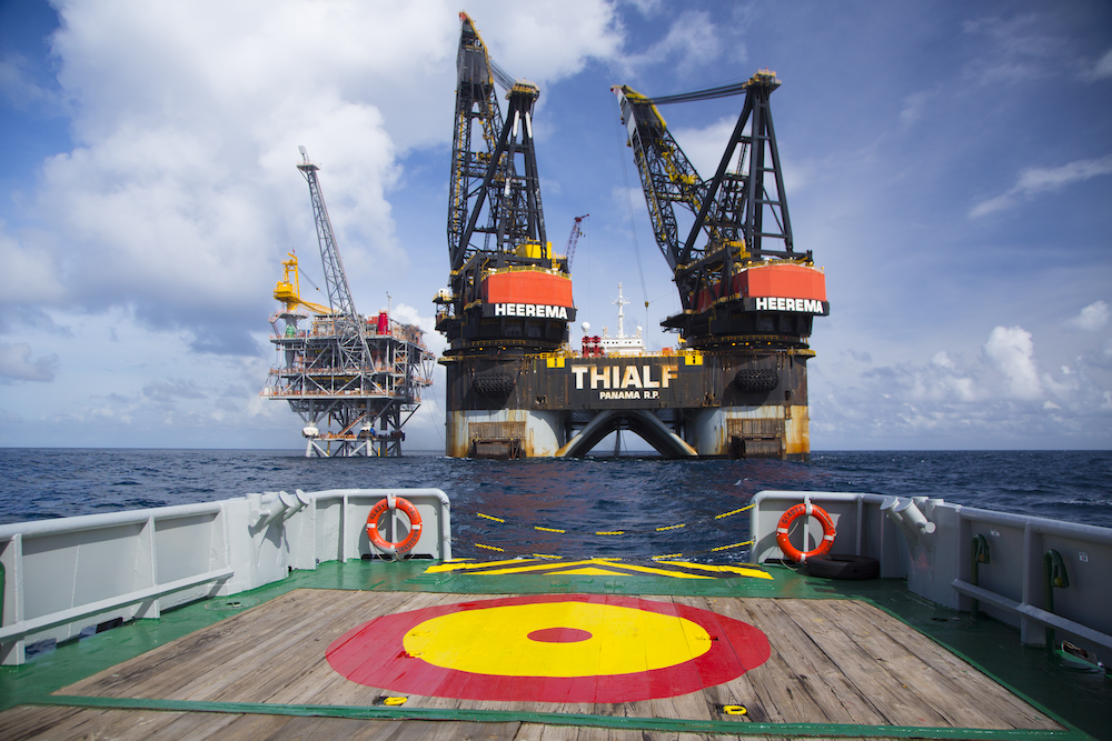 Miles off-shore, the platform is eventually manoeuvred into place by the impressive THIALF heavy lift vessel.